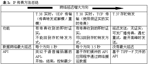 IP傳真方法的一個(gè)總結(jié)顯示于表1之中。通過(guò)選擇功能、業(yè)務(wù)需求以及所用網(wǎng)絡(luò)的延遲,就能得出最適合指定應(yīng)用的傳真方法。