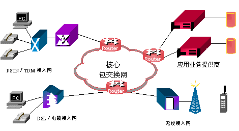 未來的網(wǎng)絡將會以基于數(shù)據(jù)包的網(wǎng)絡為核心,交換系統(tǒng)以IP交換和ATM交換等構(gòu)成,能實現(xiàn)包括語音、數(shù)據(jù)和視頻的所有交換需求。各種接入網(wǎng),如:無線網(wǎng)、有線電纜網(wǎng)、DSL、TDM(時分多路復用)交換網(wǎng)等,通過路由器接入到核心網(wǎng)絡。