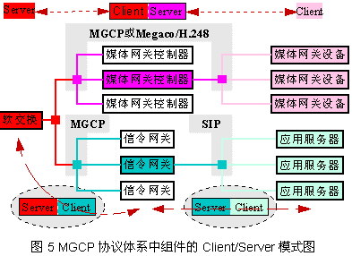從前面的圖4我們已經(jīng)看到,在MGCP協(xié)議體系中的主要部件包含媒體網(wǎng)關(guān)控制器(MGC:Media Gateway Controller)、媒體網(wǎng)關(guān)(MG:Media Gateway)、信令網(wǎng)關(guān)(SG:Signaling Gateway)、媒體資源(Media Resource)。其中的媒體資源,包含編解碼器(Codec)、調(diào)制解調(diào)器(Modem)、交互式語聲應(yīng)答系統(tǒng)(IVR:Interactive Voice Response)、橋路器(Bridge)等。