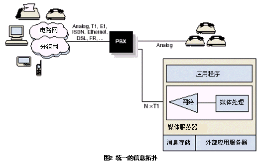 圖2是有前提的典型統(tǒng)一消息拓?fù)鋱D。這個(gè)例子中媒體服務(wù)器管理消息的存儲(chǔ)和提取,這些消息包括語(yǔ)音、傳真、數(shù)據(jù)或視頻。它可以訪(fǎng)問(wèn)不同媒體文件以及必要的控制規(guī)則以實(shí)現(xiàn)各類(lèi)媒體業(yè)務(wù)?梢栽诒镜氐拿襟w服務(wù)器上也可以在遠(yuǎn)程的集中存儲(chǔ)系統(tǒng)上進(jìn)行存儲(chǔ)。在這種情況下,能提供語(yǔ)音和傳真資源的統(tǒng)一的消息系統(tǒng)通常和email系統(tǒng)比如微軟的Microsoft