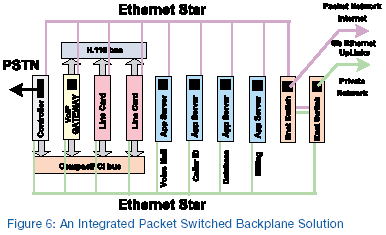 PICMG 2.16兼容平臺(tái)上,這種解決方案充分利用了有背板結(jié)構(gòu)的以太網(wǎng)交換的集成特性,以提供任意插槽(節(jié)點(diǎn))和以太網(wǎng)交換插槽兩者之間的物理連接。有著特定的串行卡,可能是語(yǔ)音處理卡,SDSL集中器,或一塊VoIP網(wǎng)關(guān)卡,通過(guò)使用在這些卡上的CompactPCI控制平面和H.110數(shù)據(jù)平面得以實(shí)現(xiàn)。(為了清晰,額外的不被使用的CompactPCI總線部分,和相關(guān)的H.110總線部分,在圖6中忽略)