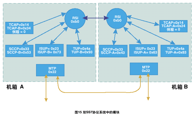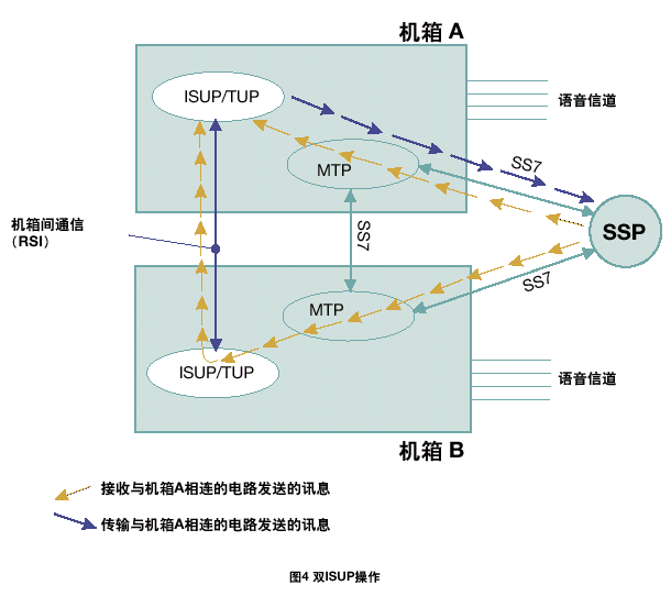 一個雙ISUP/TUP系統(tǒng)通過激活每個機(jī)箱中的一半電路協(xié)議狀態(tài)機(jī)進(jìn)行工作。每個ISUP/TUP層通過本地MTP3發(fā)送所有的傳送流量。本地MTP3采用與相鄰SS7節(jié)點之間的本地鏈路進(jìn)行傳輸,如果該鏈路發(fā)生故障,則采用機(jī)箱之間的SS7鏈路。