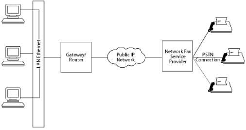 目前,許多的Internet傳真服務(wù)僅能提供存儲(chǔ)轉(zhuǎn)發(fā)傳真,這種服務(wù)在用戶(hù)電腦終端和世界其他地方的傳真網(wǎng)關(guān)連接在一起。這是一種傳統(tǒng)LAN傳真技術(shù)的擴(kuò)展,客戶(hù)端的傳真網(wǎng)關(guān)允許客戶(hù)端PC或者工作站創(chuàng)建文檔并通過(guò)一個(gè)通用網(wǎng)關(guān)發(fā)送傳真。