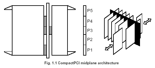CompactPCI是中間背板結(jié)構(gòu),即有多個(gè)卡插在機(jī)箱前部和后部的結(jié)構(gòu)。該體系結(jié)構(gòu)的背板位于前向插卡和后向插卡之間,提供機(jī)箱中所有插槽間的總線連接和同一機(jī)箱中前向和后向插卡之間的連接。所有的插卡通過指定的從P1到P5插槽連接到背板。這些插槽的功能在CompactPCI