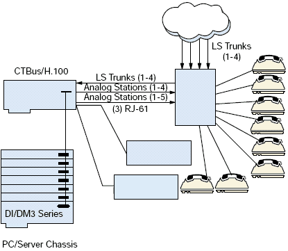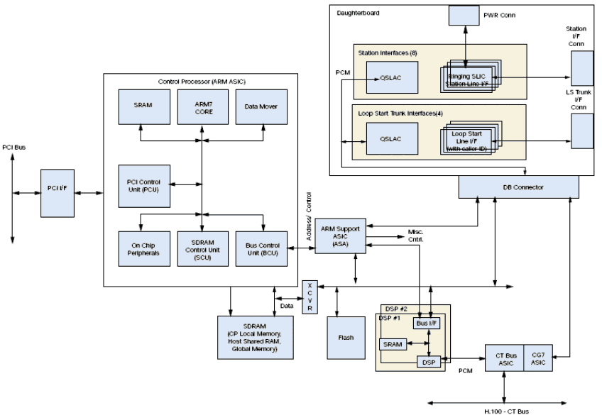 每個板卡包括三個 Motorola 563xx DSP. DSP 子系統(tǒng)包括SRAM, 某些情況下有DRAM. DSPs 直接有PCM連接到CTbus ASIC, 它提供SCbus/CTbus(H.100)和模擬座席接口之間PCM交換的功能.