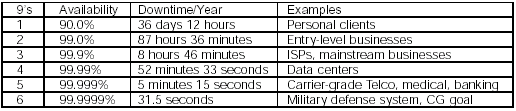 正如表中建議的那樣,實用性尤其在非常接近1的區(qū)間內(nèi)才被討論。盡管99%的正常運行時間看起來很好,它仍然將導(dǎo)致每年超過3天半的故障時間。大部分方案不會被認(rèn)為是高可用的,直到它們接近99.9%的運行時間--大概每年9個小時的故障時間。但是,通信行業(yè)使用4個9級別到5個9級別范圍的實用性。
