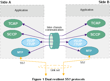 一個SS7系統(tǒng)使用ISUP、TUP或其他國家電話第4層電路交換控制協(xié)議,可以通過分離兩個物理實體(可以是同一機(jī)箱中或兩個獨(dú)立機(jī)箱的兩套板卡)之間的電路終端(每個電路有OPC、DPC和CIC組合唯一標(biāo)識)達(dá)到容錯的目的。下面的描述討論兩個機(jī)箱的情況,盡管對于處理SS7和媒質(zhì)的兩套板卡可以使用相同的方法。