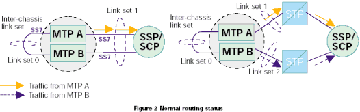 正常運(yùn)行狀態(tài)下,可用的鏈路在MTP A和MTP B之間平均分配。MTP A從本地SS7協(xié)議的第4層(User part)接收到的消息在與相鄰節(jié)點(diǎn)的鏈路上發(fā)送。同樣,MTP