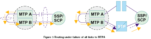 當(dāng)連接到MTP A或連接到 MTP B的鏈路發(fā)生故障時,消息發(fā)送通過MTP A和MTP B之間的鏈路發(fā)送到另一個MTP,并在可用的鏈路上發(fā)送,如圖3。