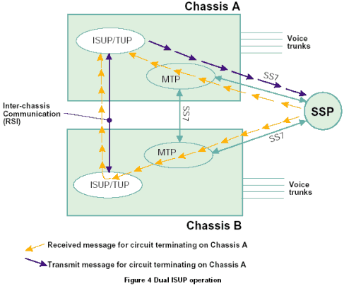 一個雙ISUP/TUP系統(tǒng)通過激活每個機(jī)箱中的一半電路協(xié)議狀態(tài)機(jī)進(jìn)行工作。每個ISUP/TUP層通過本地MTP3發(fā)送所有的傳送業(yè)務(wù)。本地MTP3采用與相鄰SS7節(jié)點(diǎn)之間的本地鏈路進(jìn)行傳輸,如果該鏈路發(fā)生故障,采用機(jī)箱之間的SS7連接。