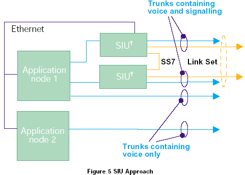 SIU通過從媒介處理中使用以太網(wǎng)分離SS7接口來處理容錯的問題,兩個SIU作為一個節(jié)點(diǎn)編碼進(jìn)行容錯,如圖5所示,通過分離SS7接口,SIU也允許系統(tǒng)最多可以由32個處理語音電路(媒介)的應(yīng)用節(jié)點(diǎn)組成。