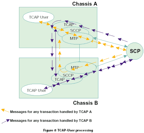 每個TCAP將所有接收的信息傳遞到同機(jī)箱中的TCAP用戶任務(wù)中,根據(jù)每一個TCAP中不同的應(yīng)用層或用戶,將TCAP層的應(yīng)用程序發(fā)送的傳送會話和組件原語傳遞給正確的TCAP。在一個雙系統(tǒng)環(huán)境中,接收的消息可以在任何MTP和SCCP層上共享。因此,一個TCAP層接收由其他TCAP處理的應(yīng)用在激活事務(wù)上的TCAP消息是可能的。