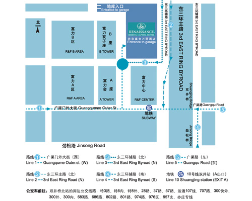 場(chǎng)館交通信息 名 稱:北京富力萬麗酒店 Renaissance Beijing Capital Hotel 公 交:特3路/特8外環(huán)主路/特8快車內(nèi)環(huán)/特8內(nèi)環(huán)主路/特8快車外環(huán)/特8外環(huán)/特8內(nèi)環(huán)/28路/7區(qū)間(高峰車)/37路/57路/運(yùn)通107線/214夜班/300內(nèi)環(huán) 300快車內(nèi)環(huán)/300快車外環(huán)/300外環(huán)/348路/683路/686路/707路/801路/802路/974路/976區(qū)間 雙井橋北站下車 地 鐵:10號(hào)線雙井站下