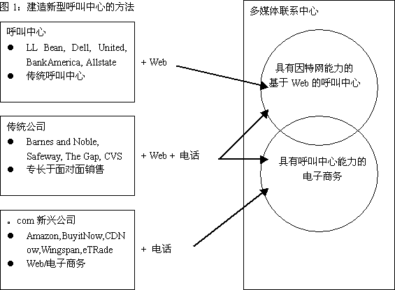 所有的公司都迫切希望找到一種途徑,使自己擁有“具有因特網(wǎng)能力的、web集成的呼叫中心”或“具有呼叫中心能力的電子商務網(wǎng)站”。圖1所示為實施方法的一個實例。但是,不管你如何稱呼它,如何達到目標,你都會面臨處理多媒體聯(lián)系的挑戰(zhàn)。多媒體聯(lián)系中心包括通過電話簽定合同和處理來自web的合同,可能是通過電子郵件,文本交談,電話呼叫,或通過web的語音呼叫。并且,大多數(shù)時候是由同一組人處理多種媒體服務。